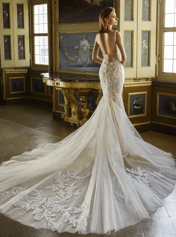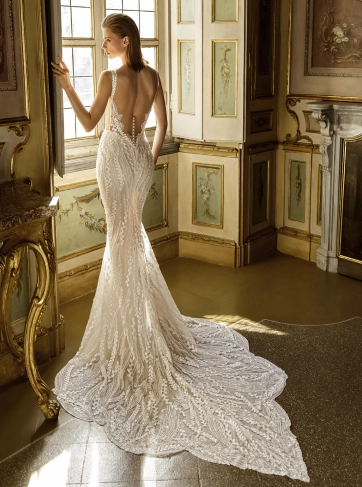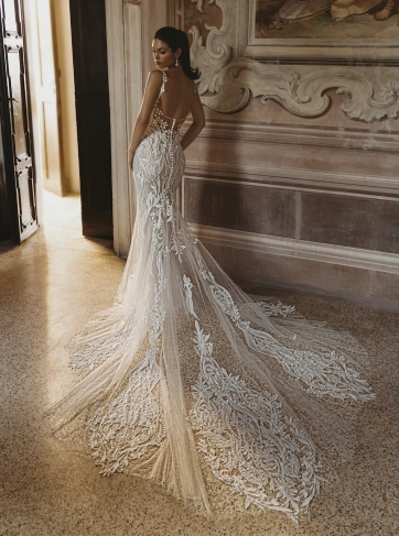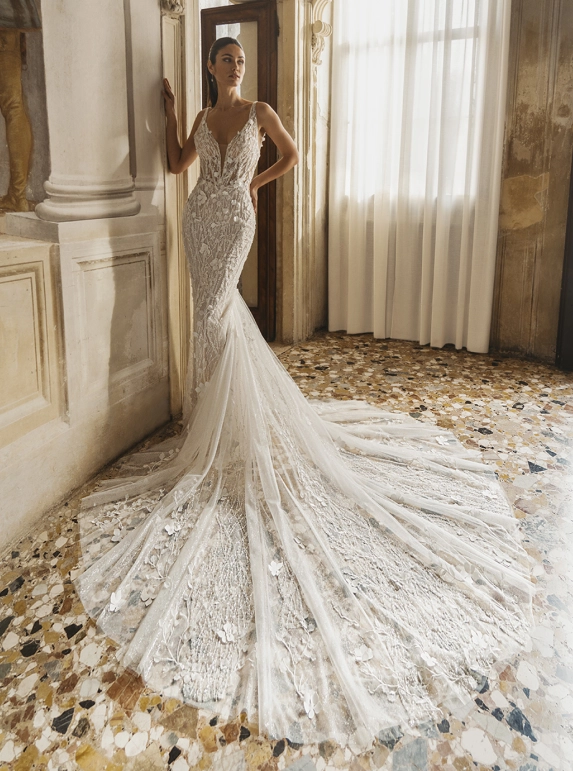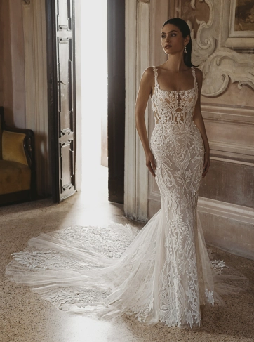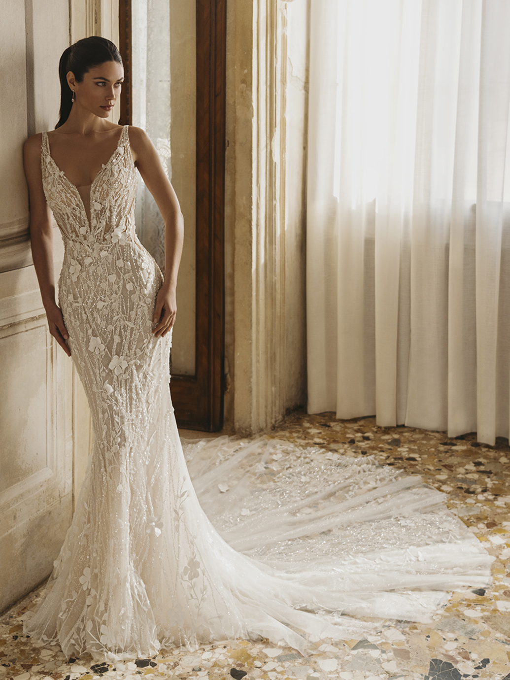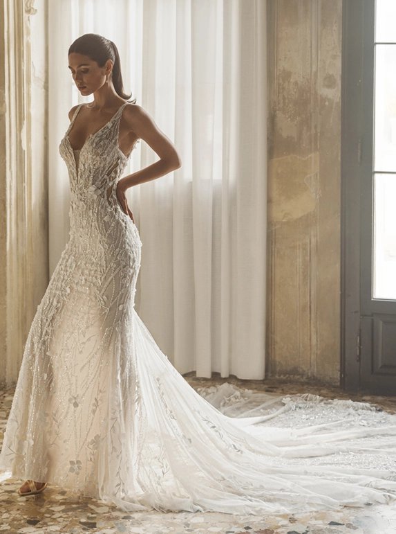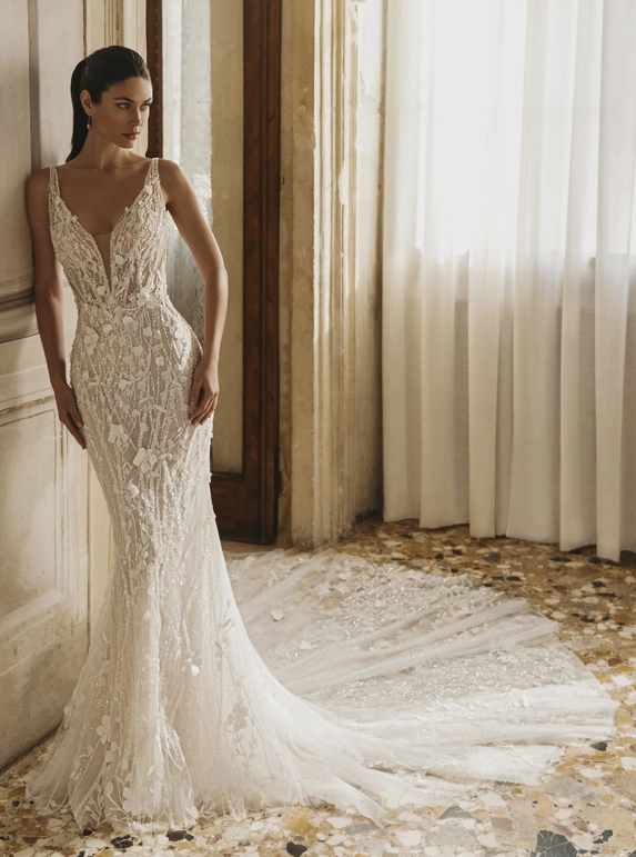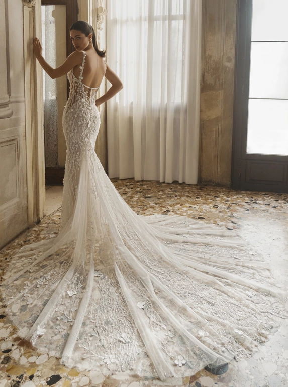 CAITLIN is a glamorous sheath silhouette adorned with 3D Mikado floral appliques and beaded geometric lace for an extra touch of sophistication. Enhanced by glitter tulle, the gown shimmers subtly, while the tulle and chiffon lining ensures comfort and movement. With its elegant design and meticulous detailing, this gown is a radiant choice for the modern bride on her special day.