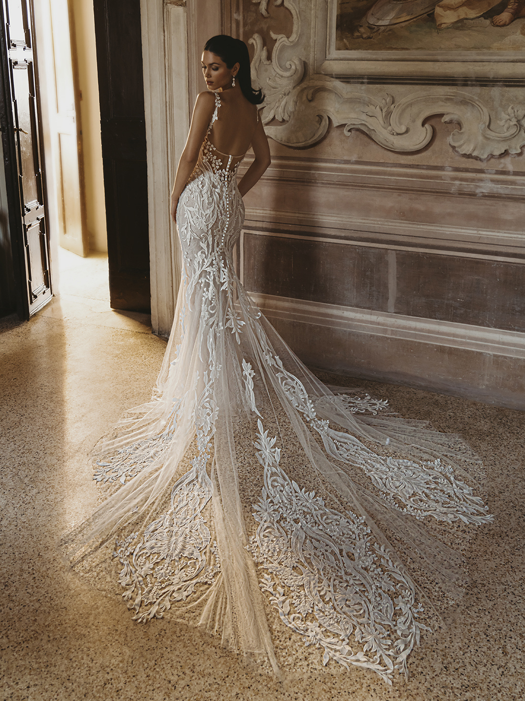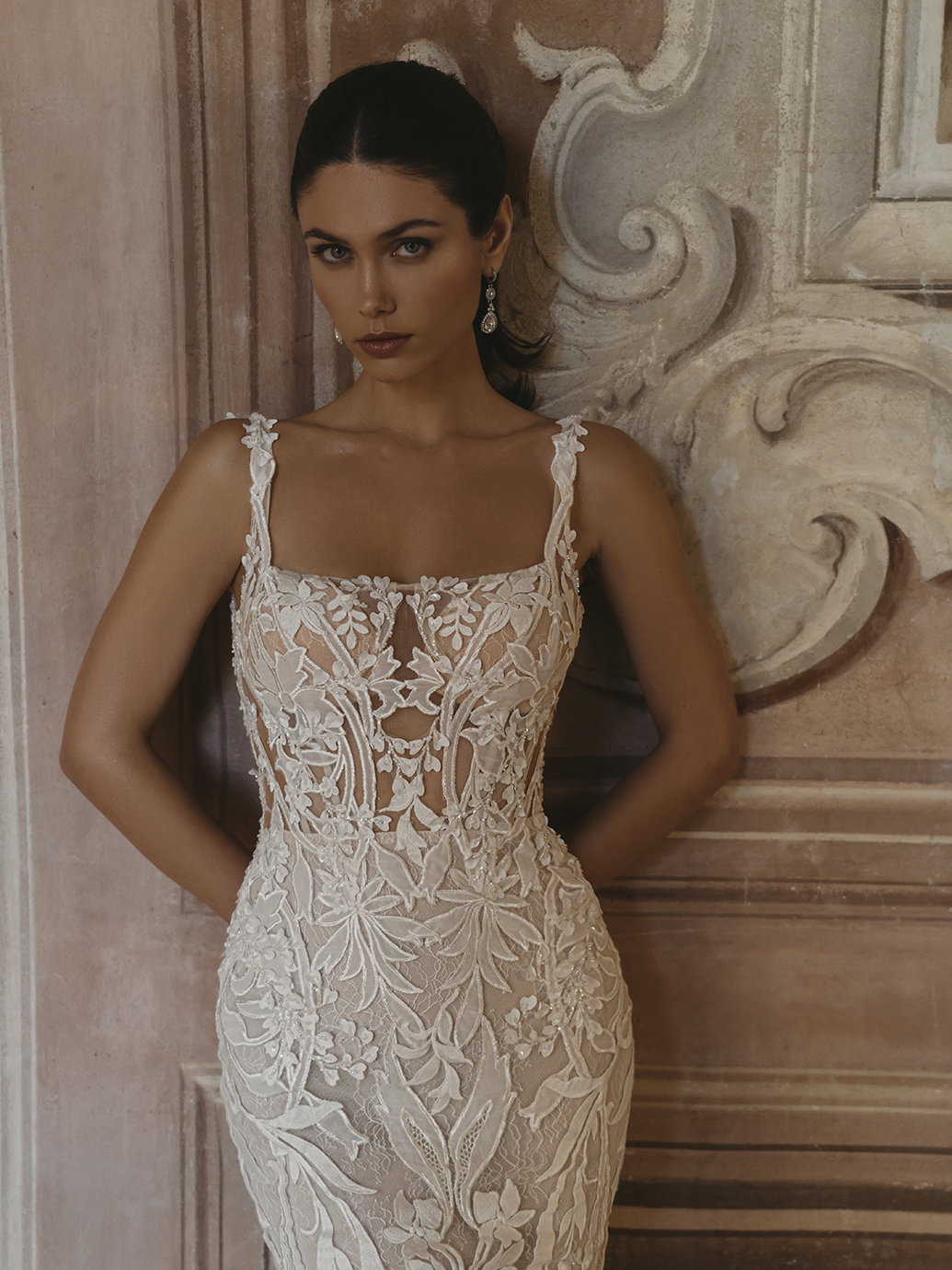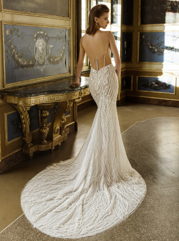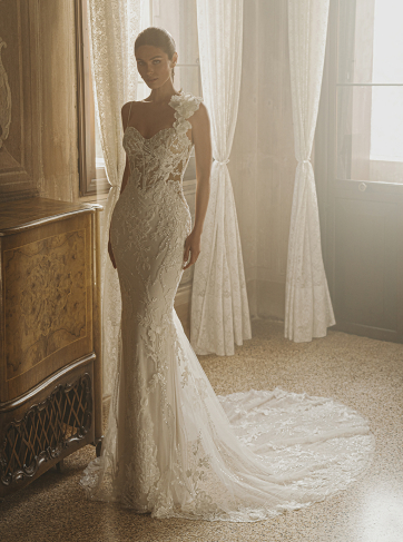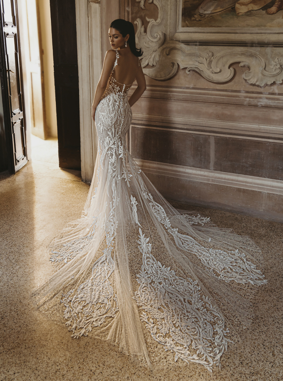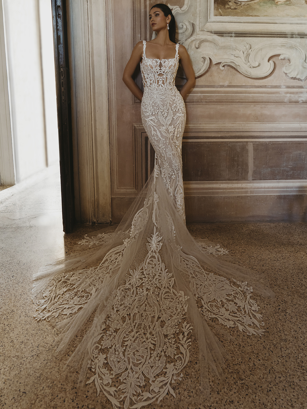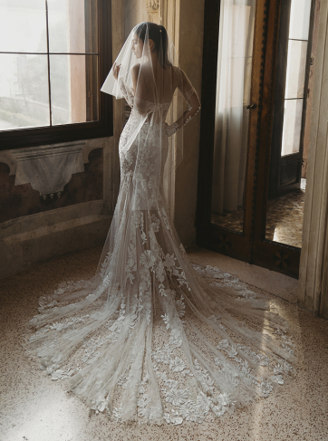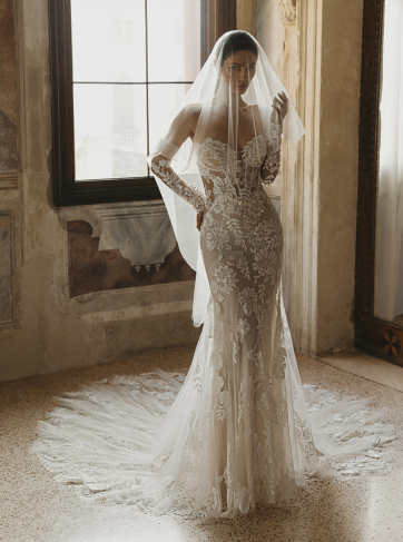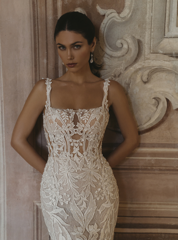 Embrace sheer romance in the CLARIS gown, where delicate detailing meets captivating design. This mermaid gown features a square neckline that frames the décolletage, while the combination of 3D crepe floral embroidered lace, 3D leafy lace, and floral embroidered lace adds dimension and texture. With Chantilly lace and a tulle and chiffon lining, this gown offers a luxurious feel alongside a flattering fit, ensuring you feel like royalty as you walk down the aisle.