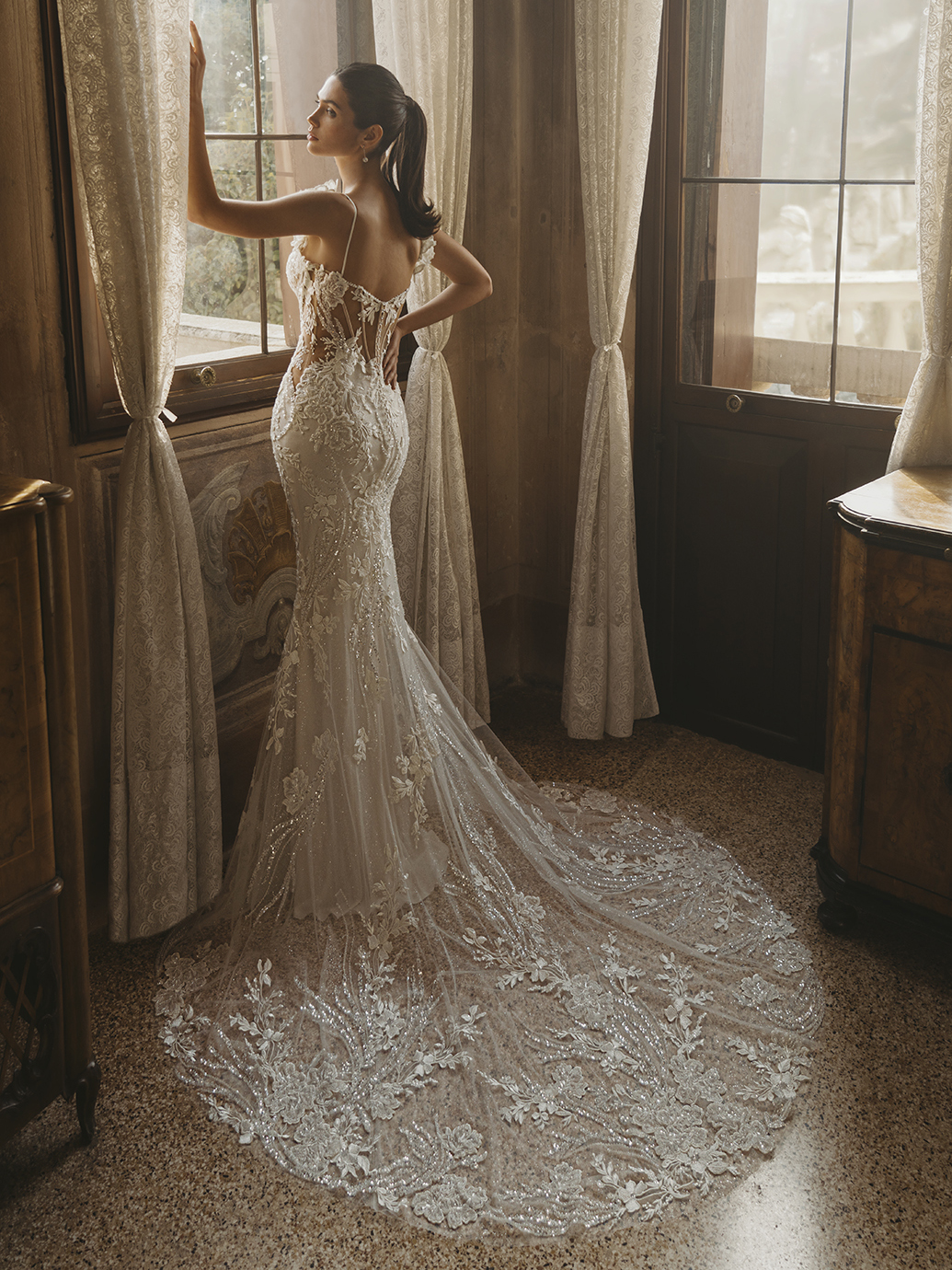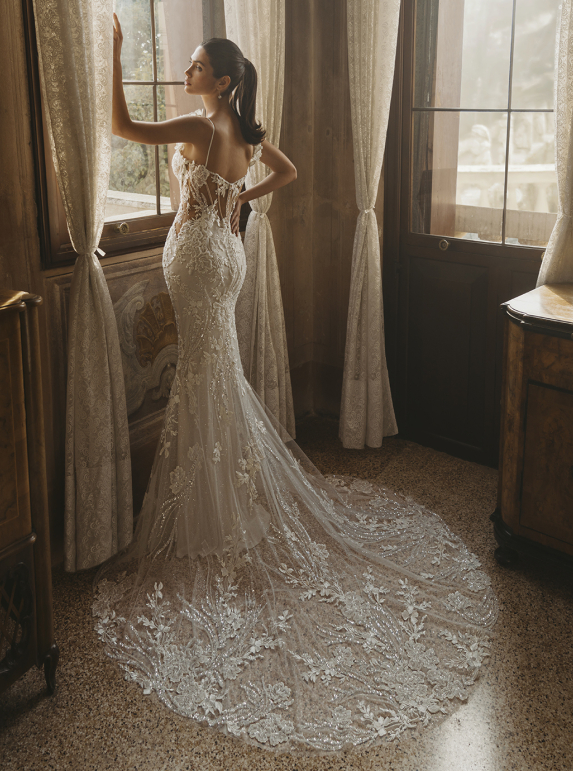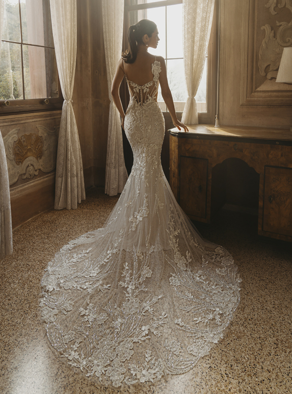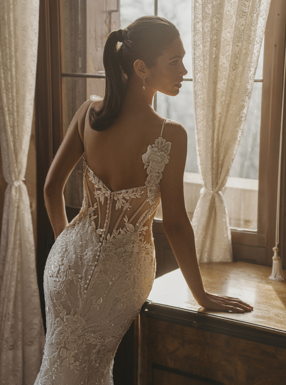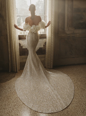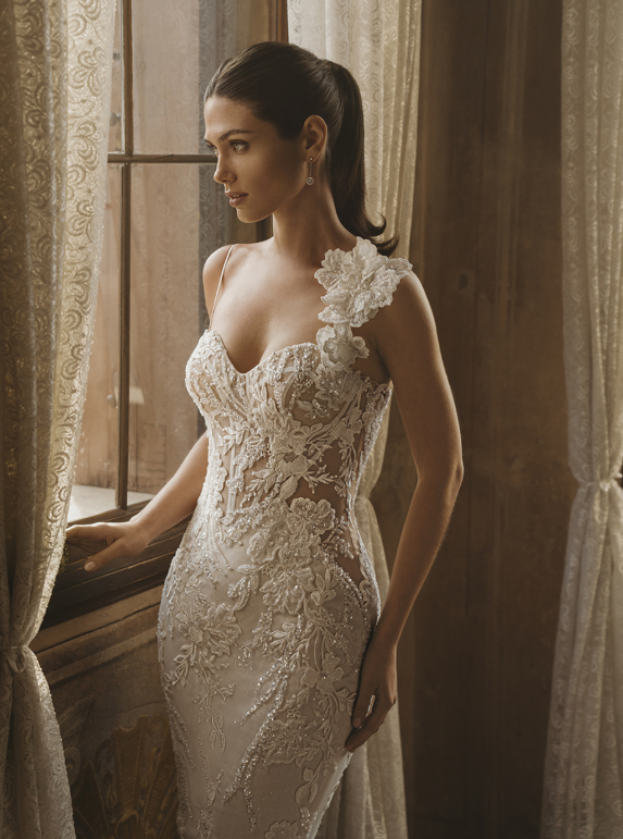 CORDELIA is here to captivate hearts with its sparkling floral embroidered lace sheath silhouette, showcasing a romantic one-shoulder neckline adorned with a bold flower accent and beaded 3D floral embroidered appliques. The intricate beaded swirl lace and floral overlay adds dimension and texture, while the soft tulle and jersey lining ensures effortless glam and ease of movement.