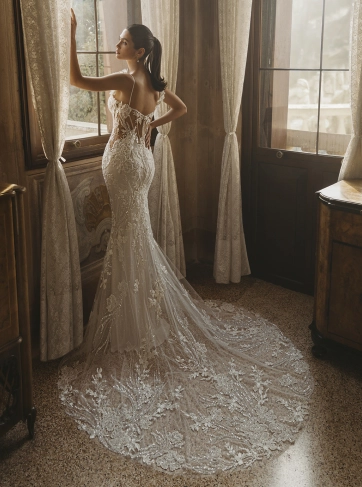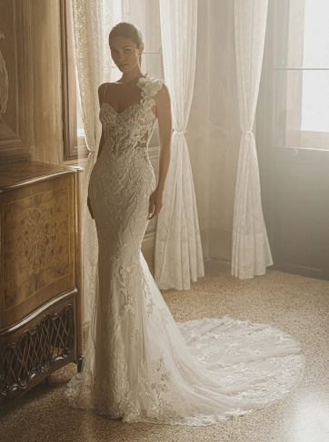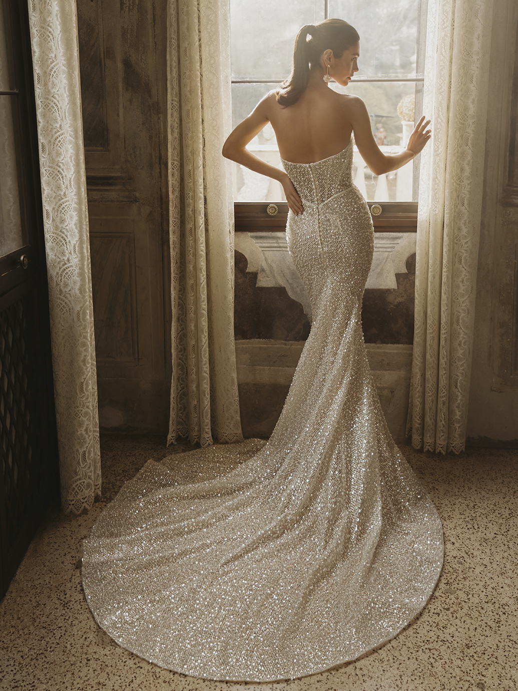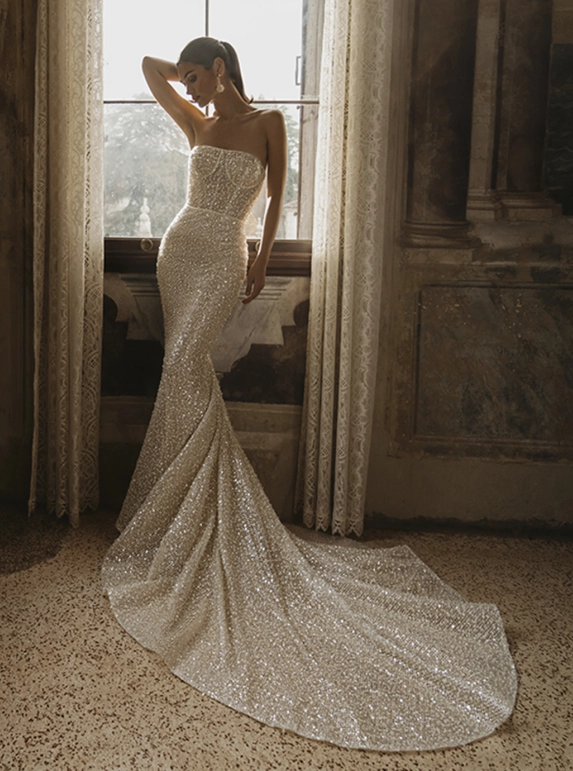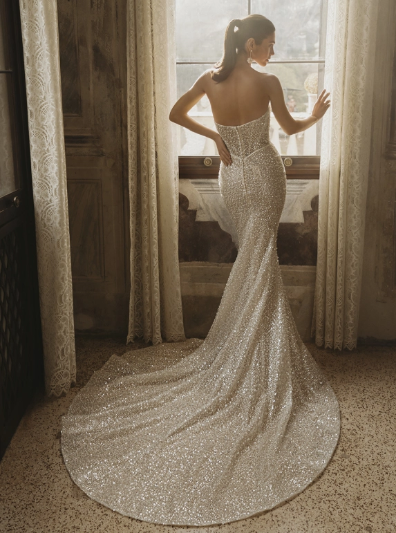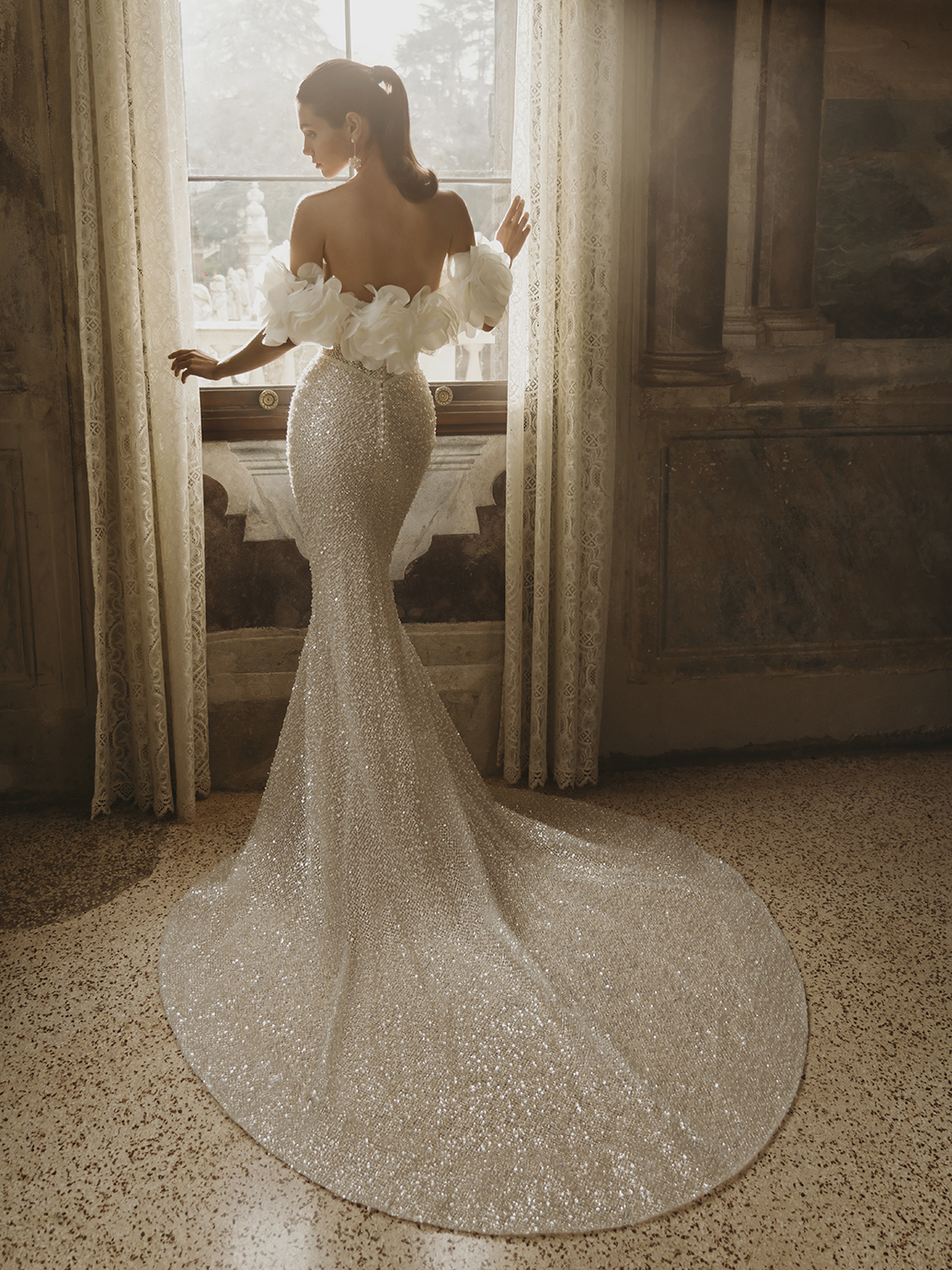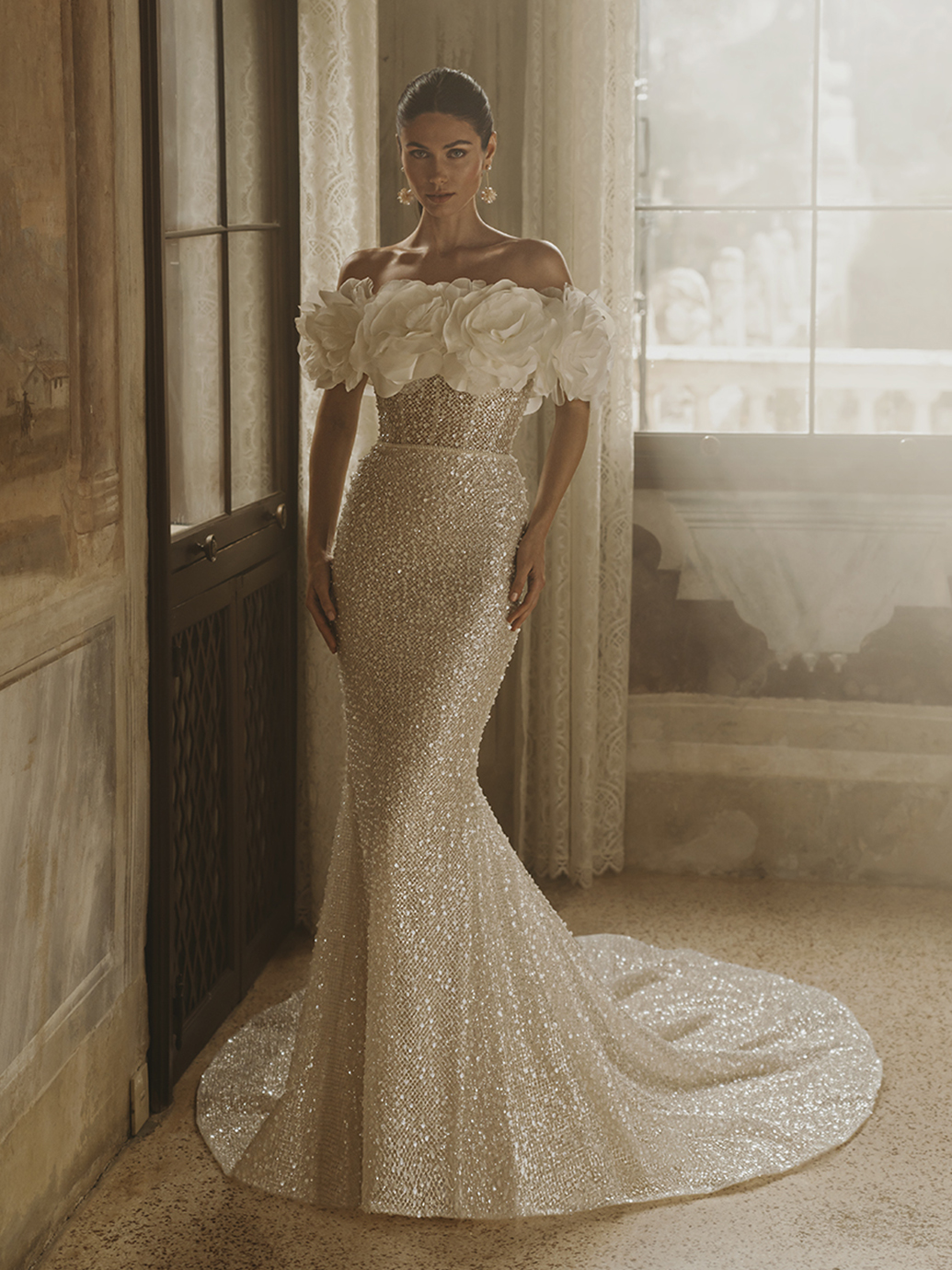 Embrace opulent glamour in the breathtaking CRYSTAL gown, featuring luxurious beaded fabric that glimmers with sophistication and style. The glitter tulle overlay adds radiant sparkle, while a tulle and chiffon lining ensures a comfortable, flattering silhouette. Draped elegantly off the shoulder is a mesmerizing 3D flower shawl, adding a romantic statement to this unforgettable bridal ensemble.